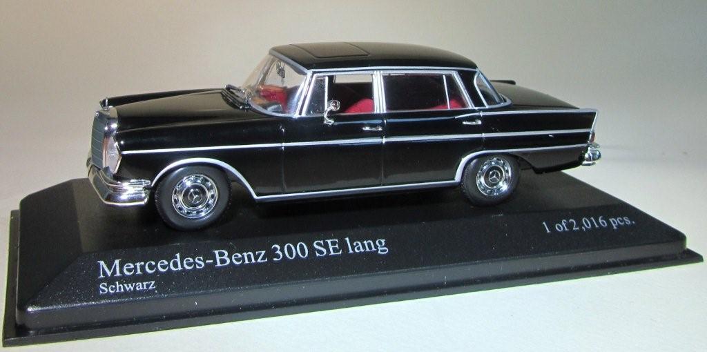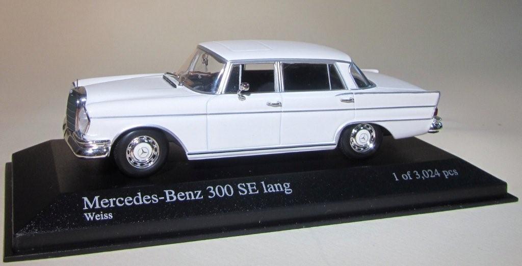 The 300 SE models were the best Mercedes could offer before the arrival of the 600 models (W100). The 300 SE had a fuel injection engine that was based on the engine of the famous 300SL Gullwing. All 300 SE's were fitted out with air spring suspension, power-assited steering and automatic transmission as standard. To distinguish them from the cheaper six cilinder models, Mercedes put extra chrome trimming round the wheelarches and along the body sills. The name '300SE' can be found on the chrome airvent. The Long Wheel Base 300 SE can be recognized by the lack of chrome on the C-pillar and, when looking carefully, by the 10 cm longer back doors.