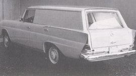 ![]() Although this car looks very elegant it never made production. You might say that it looks a bit like a W108 or W109. Note that the car has got the 300SE chrome trim on one side and not on the other. The rear looks very much like a Coupé, already having the same rearlights but lacking the same bumper. Looking this way, the car would have to loose its nickname unfortunately. |