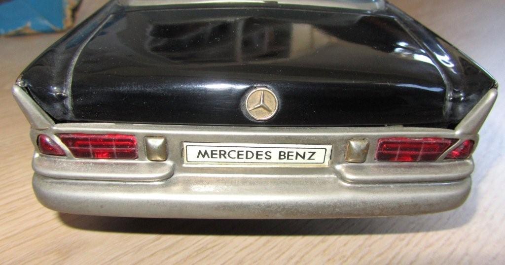 The largest Heckflosse model in my collection! At 37 cm (14,5 inches) it stands proudly amoungst my other models especially considering the smallest one in the collection measures 2 cm. TN stands for Toy Nomura, founded in Tokyo in 1923, one of the oldest and largest of the Japanese tin toy manufacturers. Although TN changes its name after the Second World war to Nomura Toys, the trademark "TN" is kept. Since TN takes on many orders from wholesalers and export companies, not all products show the "TN" initials. Below you can see the attention to details TN gave the Heckflosse Mercedes. |