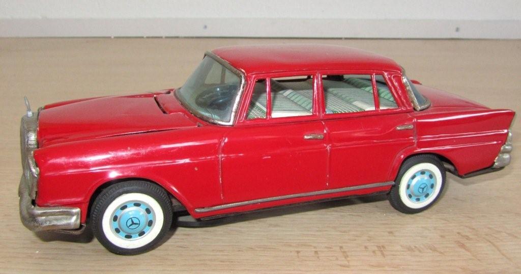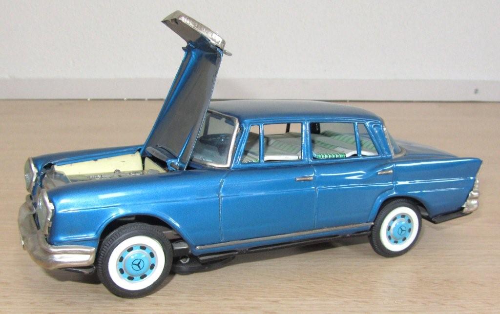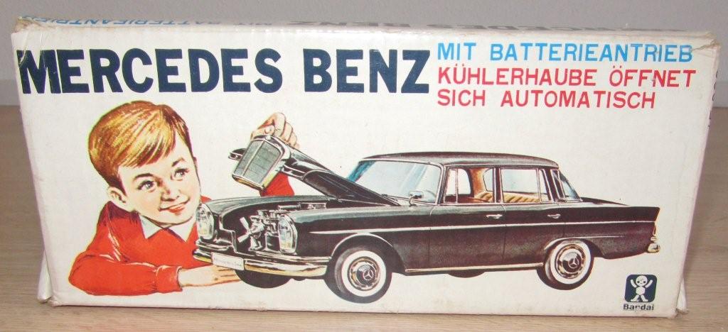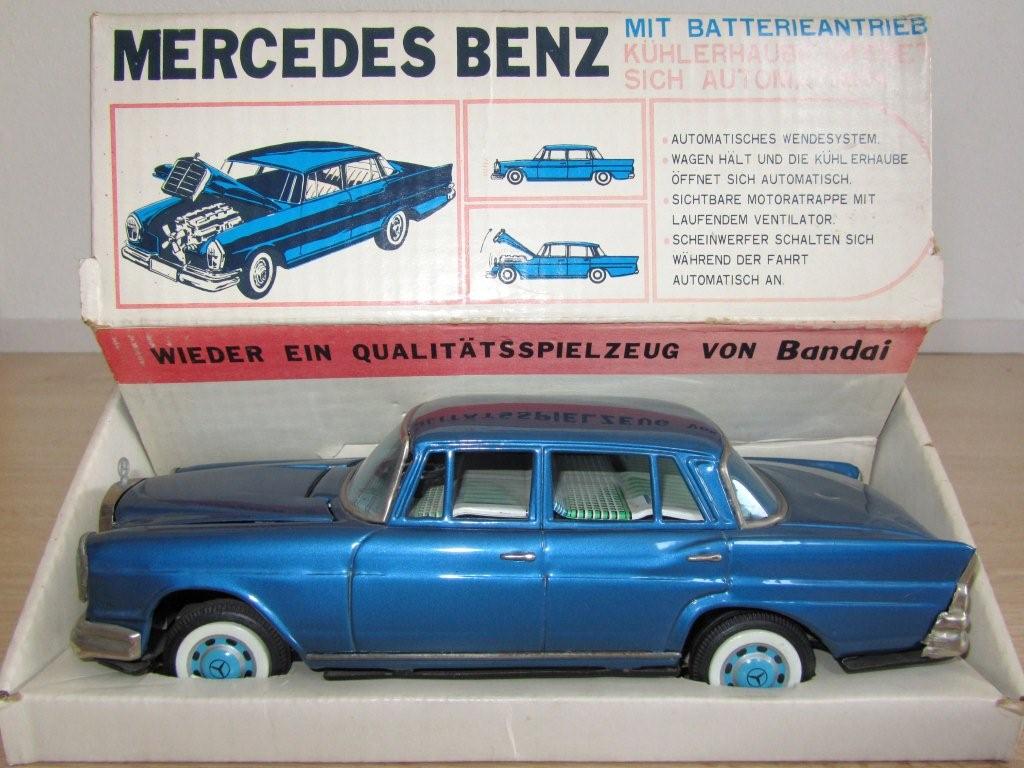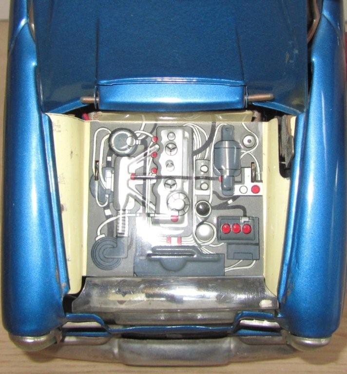 What a lucky boy or girl would you have been in the 1960s to get this present? The box speaks for itselfs I think and doubles as a showcase as well as you can see. Bandai itself was founded in July of 1950 in Tokyo and belongs to the very few traditional manufacturers who have survived until today. Production of tin toys, however, is discontinued in the seventies. With the small special issue "Bandai-Line" produced in korea. Bandai is still represented in the tin model market until the end of the seventies. The great majority of Bandai products are marked with either a stylized "B" or also with the entire name in large letters stamped in relief in the vehicle undercarriage. The motto "Sign of Quality" can be found on many on the Bandai pieces. As you can see with this model, this car is battery operated and after drving for a while, the hood lifts up automatically to reveal an engine! Complete with fan turning! |