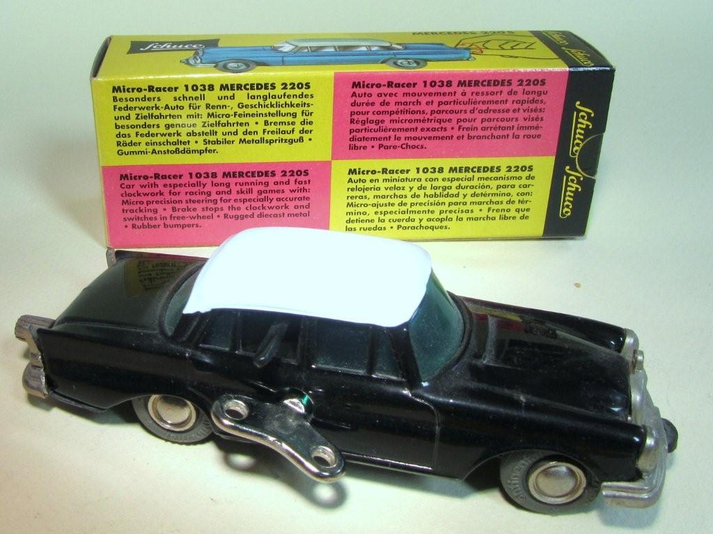 The Schuco name alone is well known for their many toy products. Schuco even came up with no less than two Heckflosse models: the Micro-Racer and the Mirako-Car, both looking the same at first glance but they do have some differences. Above here you can see one of the more common models: the MicroRacer, a car you could wind up and by releasing a lever, the car would spin off. The large turn knob at the end of the car allows for steering. This mechanism can be found with many other body shells. The white/red car above is an original model from the 1960s, the black/white model on the left below is al later re-issue of the same model. The model on the right is another re-issue but this time by the maker Nutz. The Nutz Firm Werner Nutz (Spiel-Nutz) re(produced) in the middle of the 1980s several of these Micro-Racers on condition that the name Schuco was to be deleted from the box and the base plate of the model, hence the black strips you can see on the right box. After the death of sir Nutz these models were sold to the American company Lilliput who contuined producing these models. All models can be found in other colour variations. |