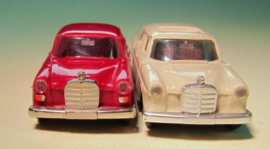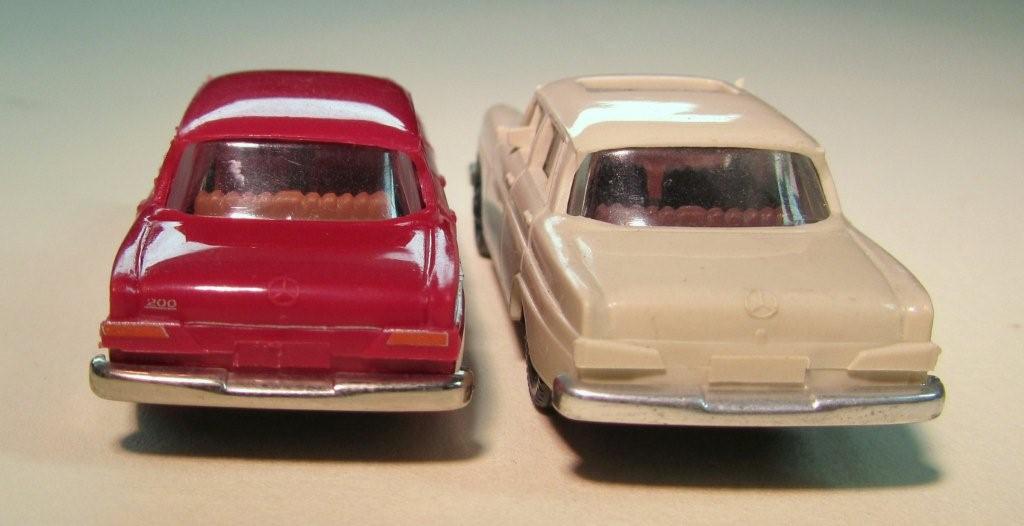 Below you can see that Brekina made some work changing the 190 models into 200. The blinker lights mounted on the front wings of the white 190 model are gone, they now are placed beneath the headlights just like all 200, 200D and 230 models have in real life (see red car). In the photo on the right you can see that on the rear of the car, the rear lights of the red car (200) are much straighter than on the white car (190) plus the 200 model clearly has a '200' badge. |